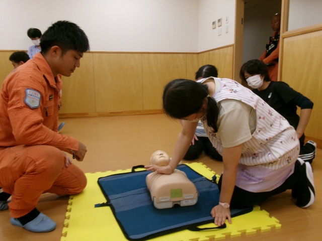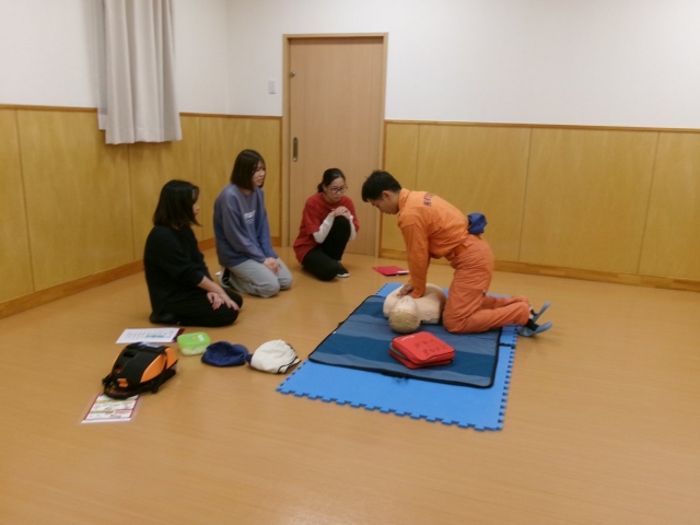 10日にAED講習を行ない、消防士の指導の下、職員による人命救助のシュミレーションを行ないました。