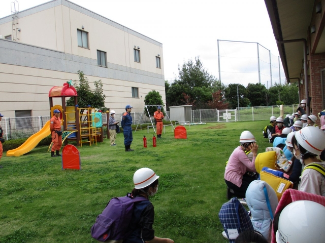 また、14日の総合防災訓練では、子ども達に見守られながら、先生達が消火訓練を行ないました。