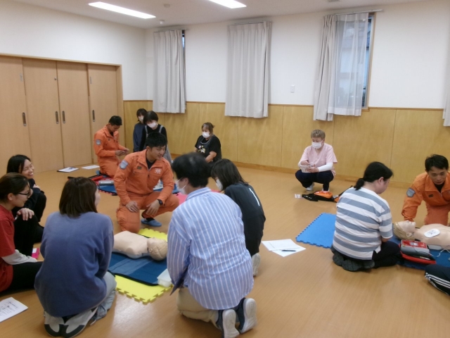10日にAED講習を行ない、消防士の指導の下、職員による人命救助のシュミレーションを行ないました。