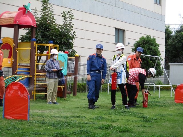 また、14日の総合防災訓練では、子ども達に見守られながら、先生達が消火訓練を行ないました。