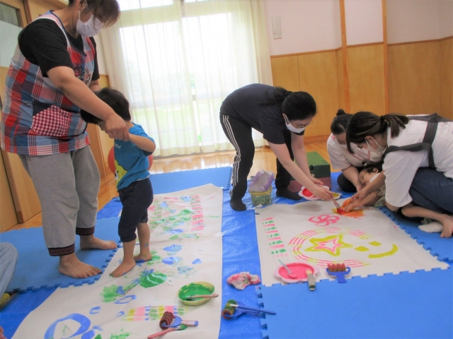 ダイナミックな絵の具遊びを一緒にして、お子さん達の普段の様子を見てもらうことができ、楽しい機会になりました♪