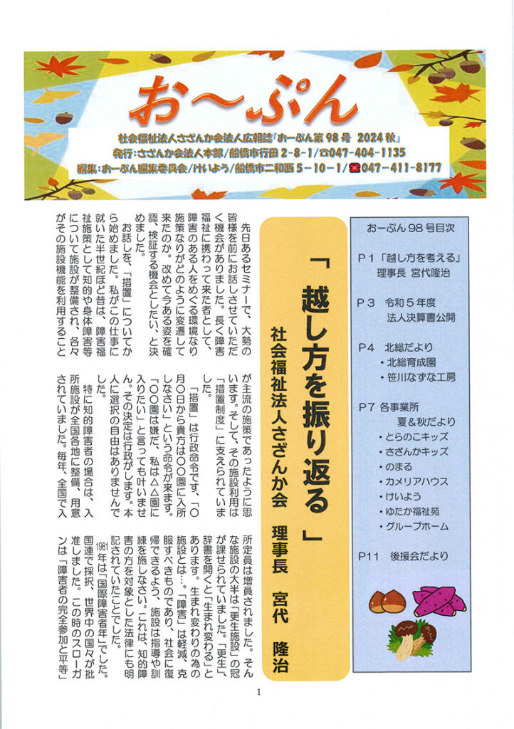 その一助として、さざんか会機関誌〝おーぷん〟を掲載しています。〝おーぷん〟は、さざんか会の様々な活動や現況をつぶさにお知らせしながら、ありのままの姿をご覧頂く事により、より一層さざんか会へのご理解を促進したいがために発行しています。