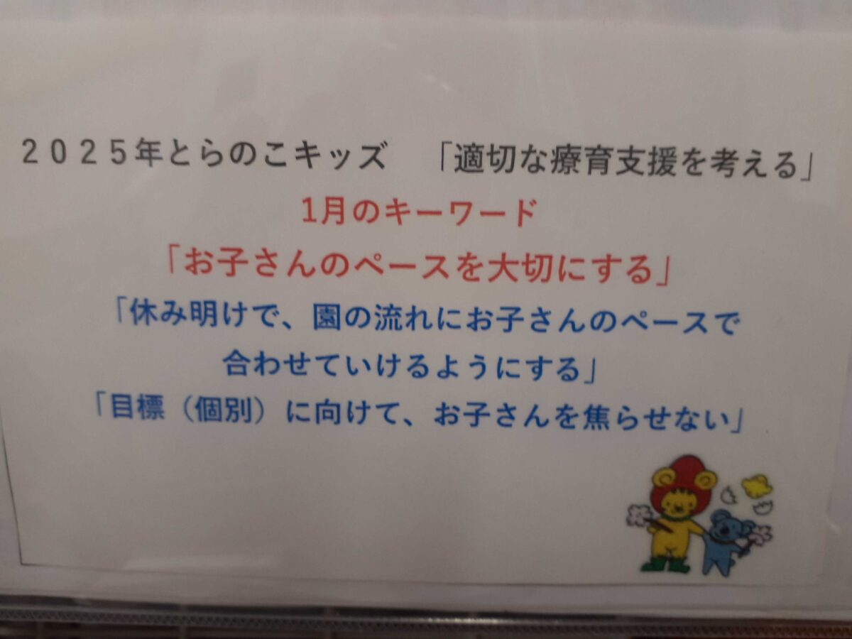 本日は1月5日(月)です。年始の最初の療育活動日となります。本年もどうぞよろしくお願いいたします。2日の夜に降りました雪も、まだ一部が園庭や周辺道路に残っています。今日は久しぶりのお子さんは登園、職員は出勤となり、今日は皆さんからだも気持ちもウォーミングアップかなと。給食はキーマカレーライスでした。明日は冷え込むみたいです。(中川)